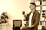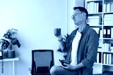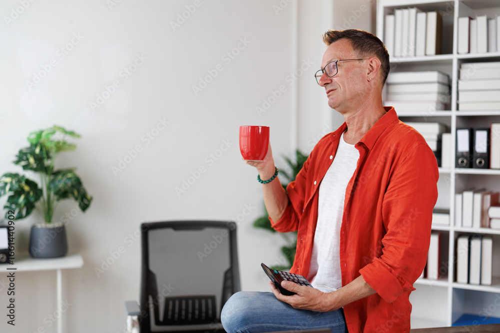 Mature businessman is drinking coffee and using calculator in his modern office, taking a break from work to enjoy a hot beverage and manage his finances