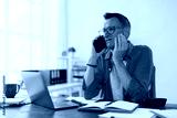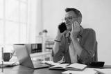 Businessman receiving bad news while talking on mobile phone, sitting at desk in modern office, working on laptop computer, worried and stressed by problems at work