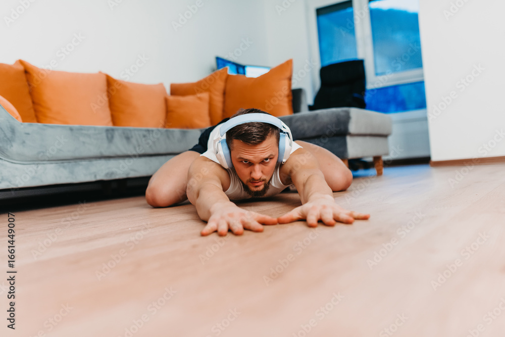 Focused young man stretching on floor with headphones during workout at home, fitness and wellness concept