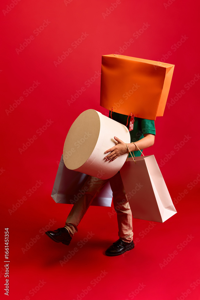 Child walking with large shopping bags and orange bag on head on red background. Concept of retail sales, discount promotions, playful consumer lifestyle, advertising visuals and editorial campaigns.