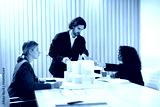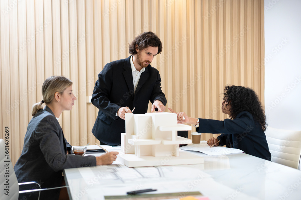 Businessman leading a meeting and presenting a housing project plan using a scale model to his colleagues in a modern office