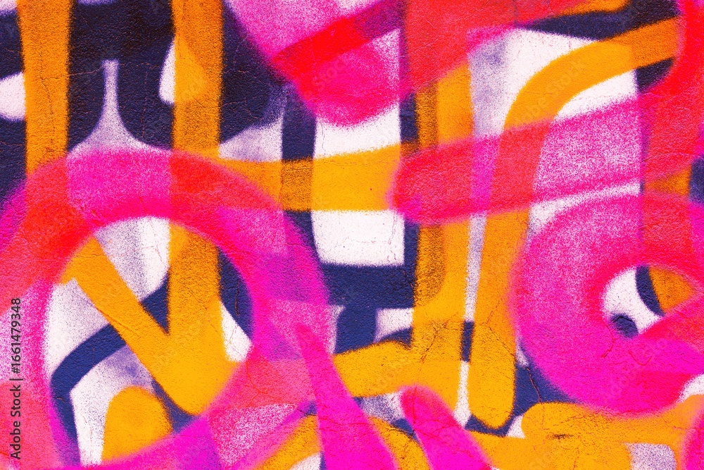 Graffiti art in bright neon pink, orange, purple on wall. 80s street style, vivid color contrast, bold lines. Urban visuals, murals, modern 90s, digital art, vibrant creative banner.