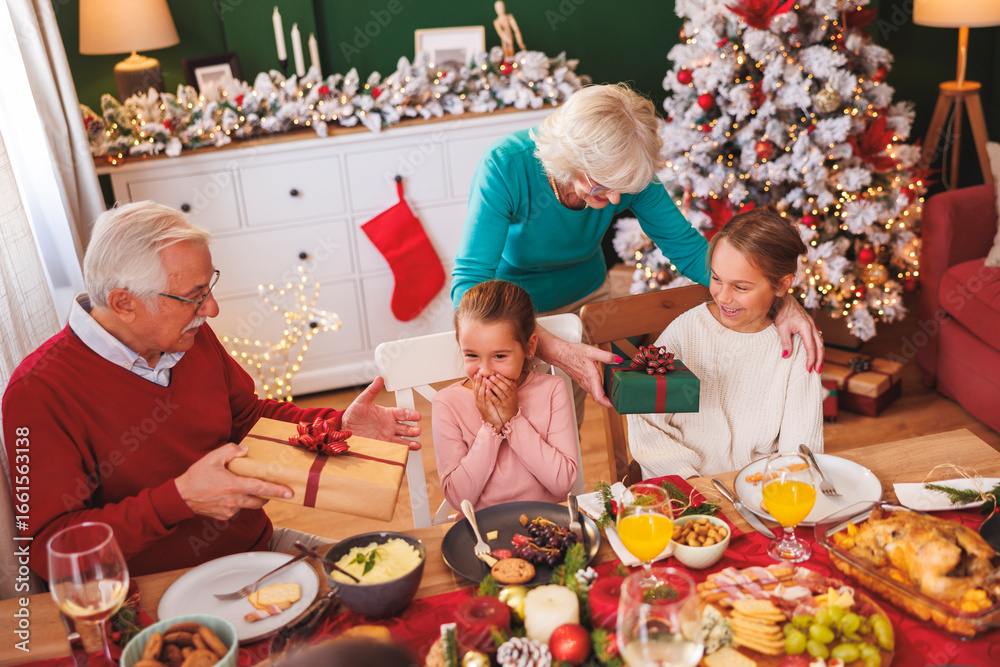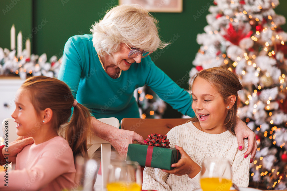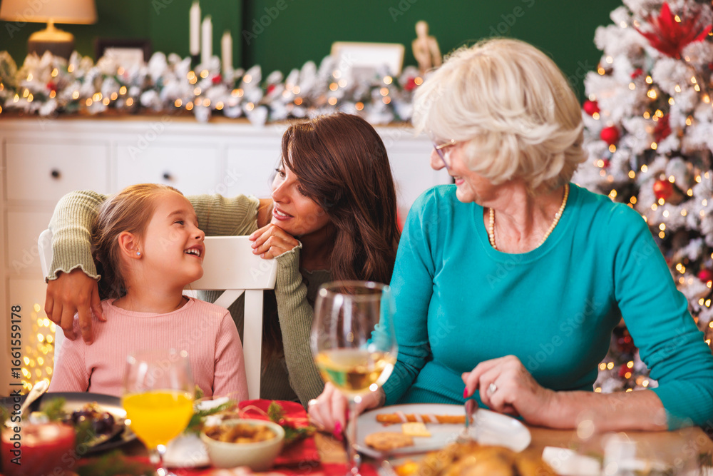Grandmother, mother and granddaughter having family Christmas dinner at home