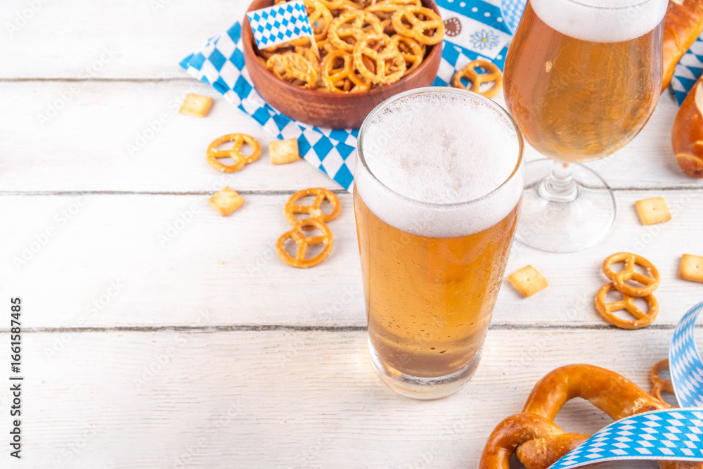 Oktoberfest holiday background with beer glasses, salted snack and pretzels