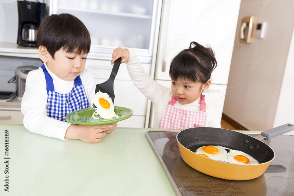 目玉焼きを皿に盛り付ける女の子