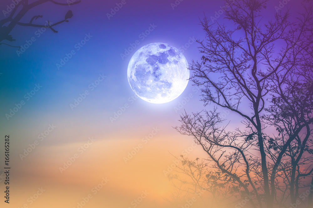 Landscape of colorful sky, foggy is swinging between dry tree and moon.