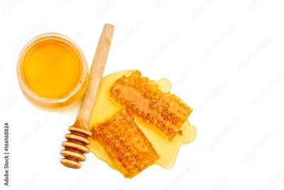 Bank with fresh honey and honeycomb on white background.