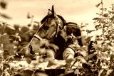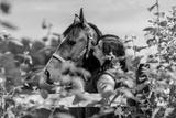 Young woman bonding with a Barb Arabian horse outdoors in summer
