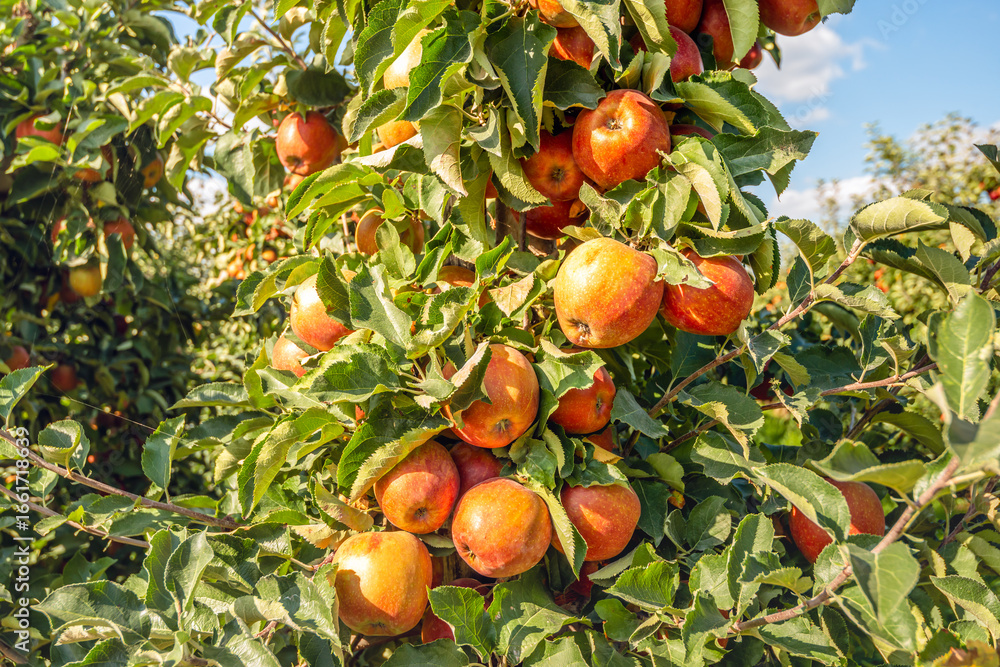 Close-up of nearly ripe apples on an apple tree. The photo was taken on a sunny summer day in a Dutch orchard with low-stemmed apple trees.
