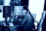Professional female programmer working on a project using multiple computer monitors in a modern office setting