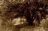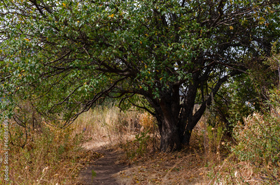 view of the mountain path with dry grass under the branches of a tree
