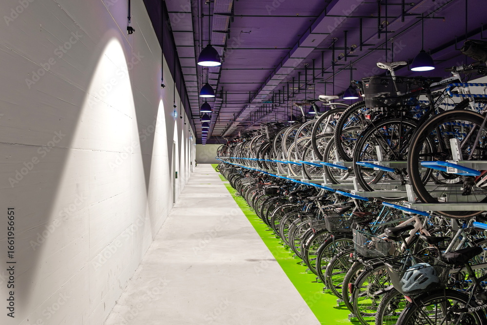 Many rows of bicycles stacked inside underground public bike parking place. Wide angle view, artificial lighting, no people
