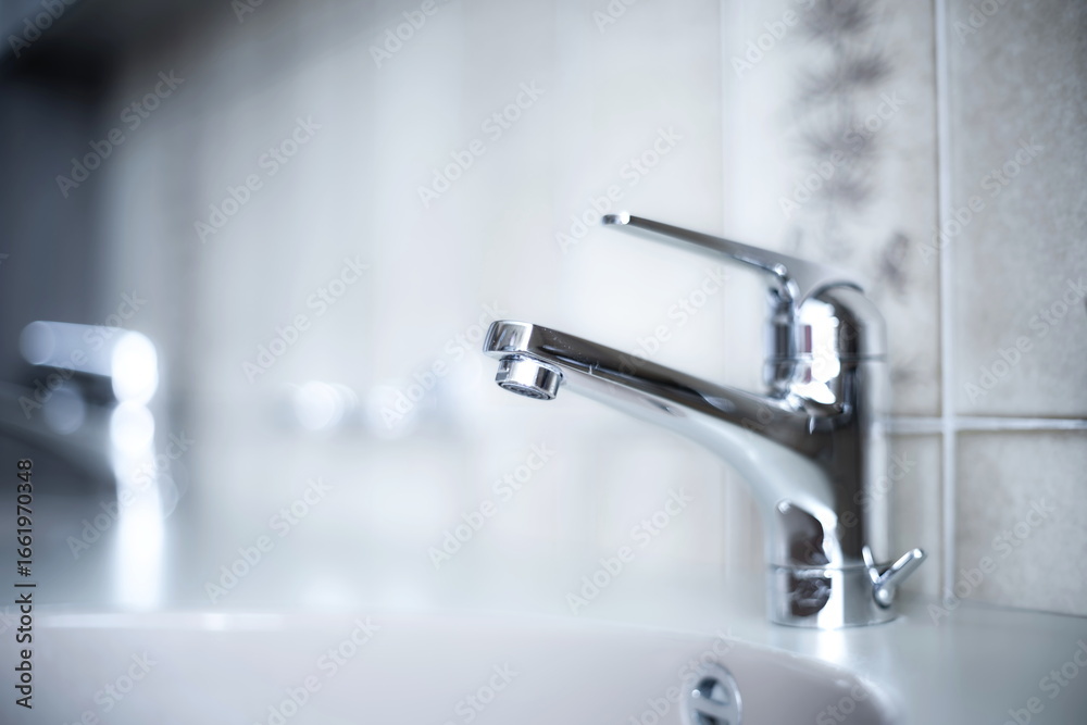 Shiny, chrome water tap inside apartment bathroom. Close up shot
