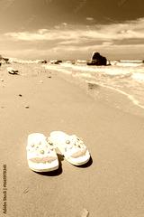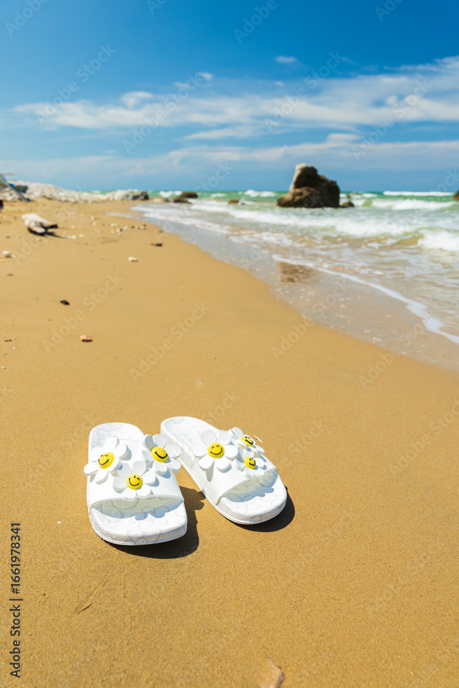 White slippers with daisy decorations resting on the sandy beach of Rodi Garganico in Apulia, Italy