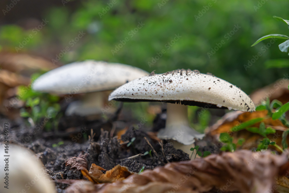 White wild mushrooms with dirt specks emerge from forest ground, surrounded by green foliage and fallen autumn leaves, symbolizing natural beauty