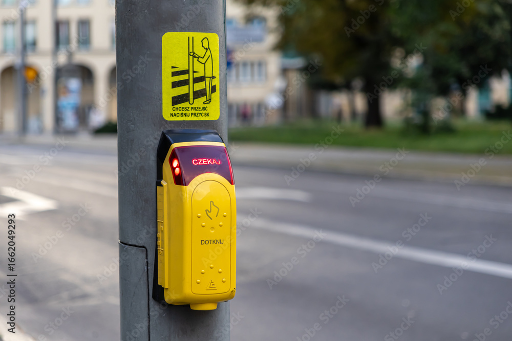Yellow pedestrian crossing button with a WAIT signal and PRESS THE BUTTON instruction on a city street pole, ensuring urban safety