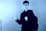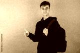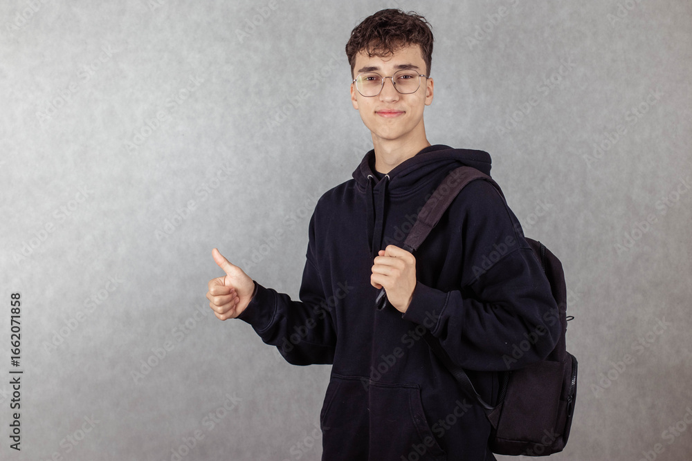 Young man, student, with backpack on back on gray background, looking at camera, pointing finger up, copy space