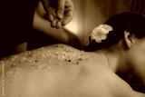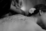 Closeup couple customer having exfoliation treatment in luxury spa salon with warmth candle light ambient. Salt scrub beauty treatment in Health spa body scrub. Quiescent