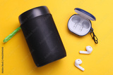 Wireless bluetooth stereo speaker with earphones on yellow background. Top view