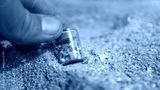A hand holding a sample jar with tiny plastic particles collected from the seashore, illustrating the environmental crisis and water contamination. Microplastic pollution on the beach.