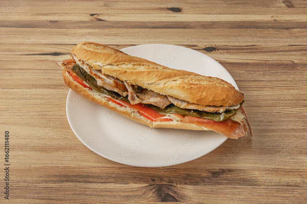 Spanish bacon and melted Manchego cheese sandwich, on a ciabatta baguette with roasted tomato and fresh basil