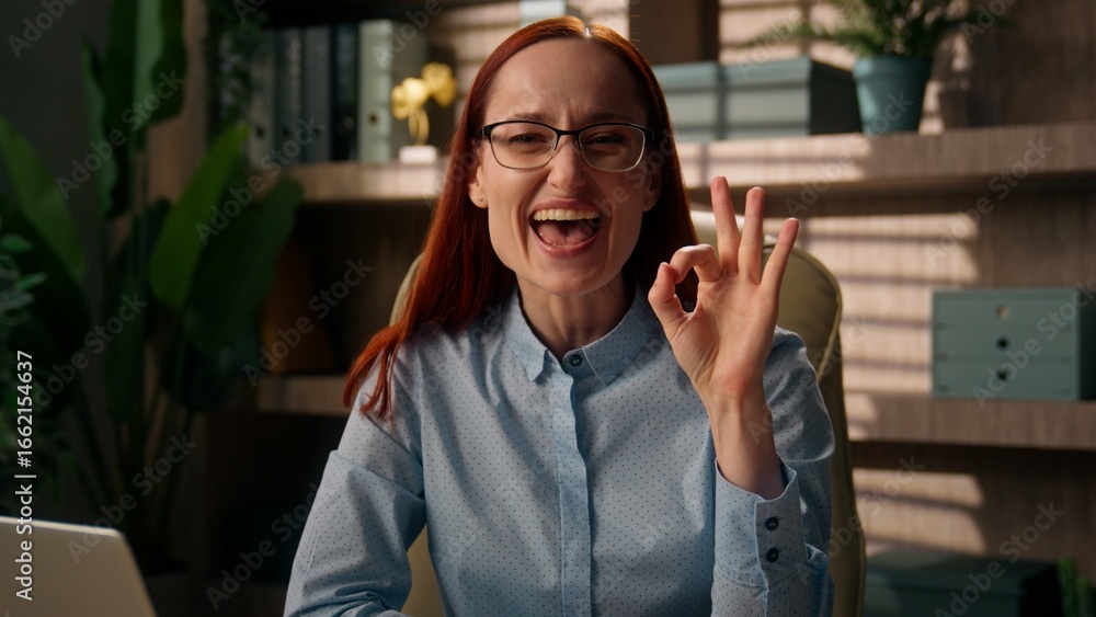 Happy smiling Caucasian business woman girl successful businesswoman female employer joyful office worker looking at camera okay ok gesture good nice excited recommend approve fine success indoors