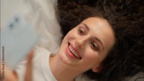 Caucasian woman girl on bed using mobile phone message dating app relaxed smiling female use smartphone online shopping blogger social media relaxing at home cozy bedroom hotel comfort morning wake up