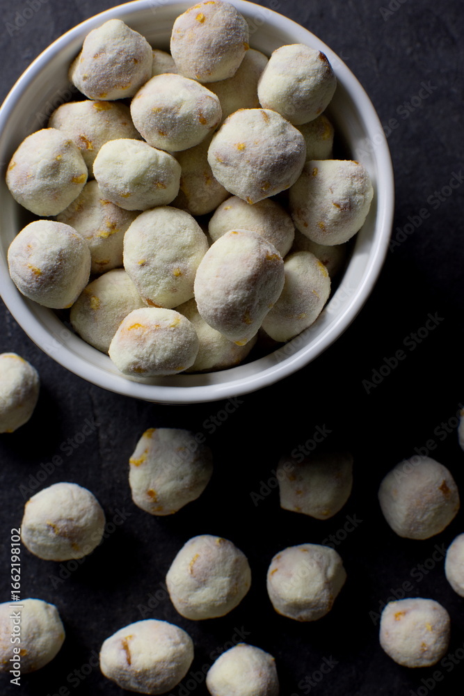 Powdered milk gourmet popcorns in a bowl in dark slate background seen from above