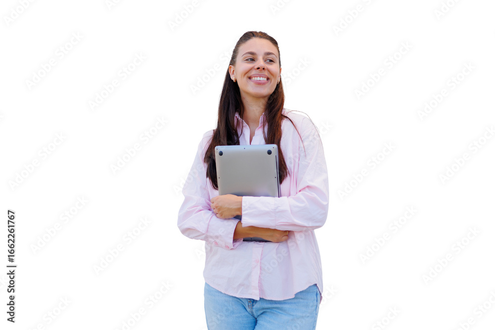 Happy businesswoman holding laptop and looking away, isolated on transparent background, ideal for easy integration into projects