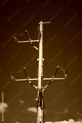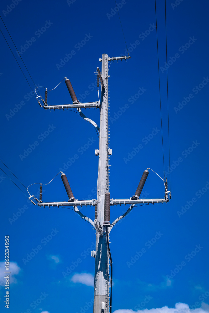 Tall utility pole stands against clear blue sky. The pole is equipped with power lines and insulators, showcasing a typical urban infrastructure element.