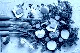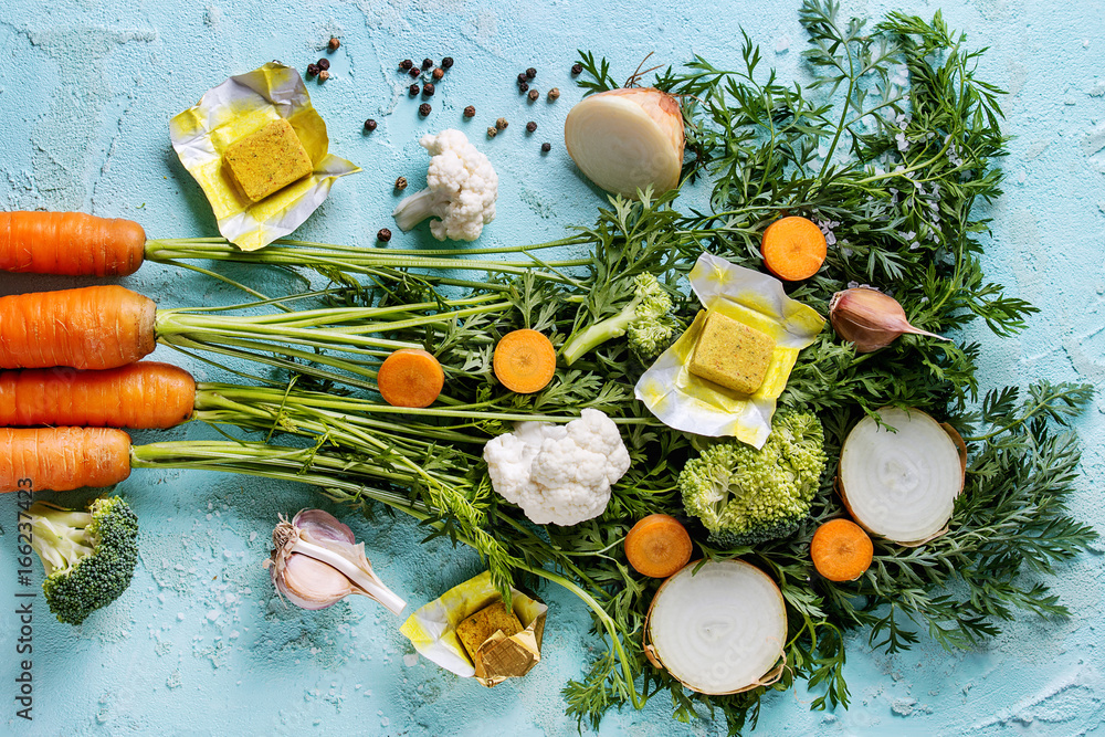 Raw vegetables and bouillon cubes for cooking soup. Young carrot with haulm, broccoli, cauliflower, onion, garlic, salt pepper over turquoise concrete background. Top view. Dinner cooking concept