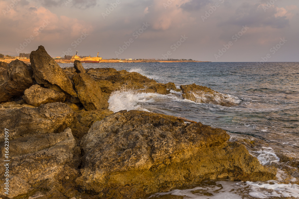 Sunset off the coast with a wreck of ship, Paphos,Cyprus