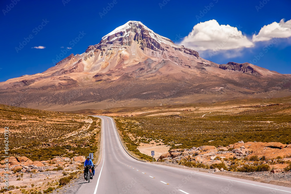 Cycling on the beautiful road in front of Nevado Sajama volcano