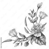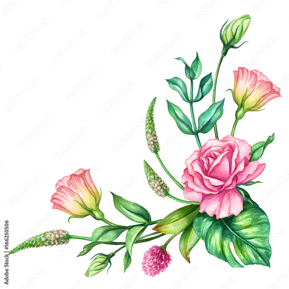 watercolor botanical illustration, pink rose flowers, tropical green leaves, floral bouquet, corner decoration, isolated on white background