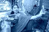 Young woman take selife of indian veg food platter or Rajasthani noth indian thaali with lots of delicious dishes with smart phone. Female enjoy lunch in eco friendly clay plate and bowls. India