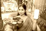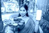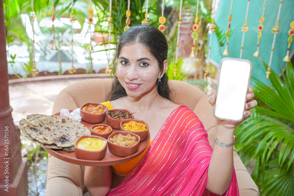 Young woman holding plate full of north indian vegetarian food platter or rajasthani thali show blank smart phone display scree for advertisement. Complete meal. Restaurant menu. India.