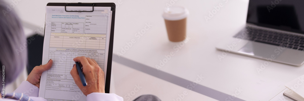 Female physician recording patient medical information prescription details onto clipboard inside a modern clinic office