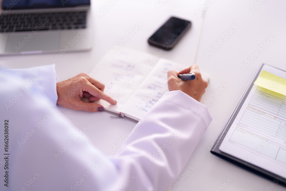 Adult Medical Professional Hands Writing Notes White Coat Bright Office Desk Productivity Research Planning Healthcare Documentation