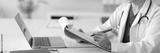 Asian adult female doctor physician medical professional documents patient chart notes healthcare provider uses laptop computer clinic office setting