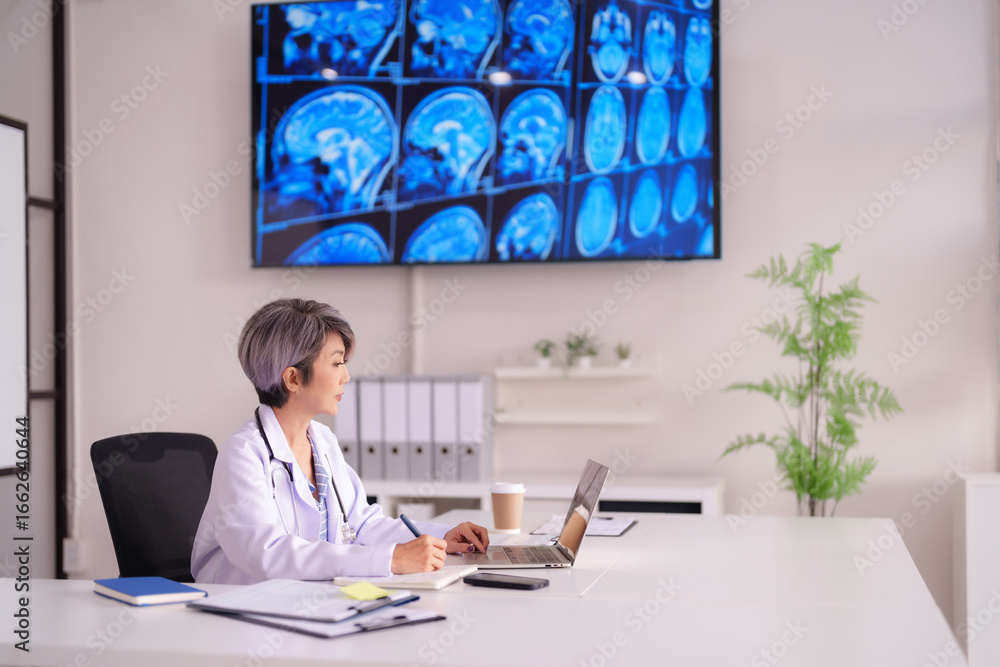 Asian female doctor reviewing brain scans on screen with laptop technology in modern medical office patient diagnosis research healthcare