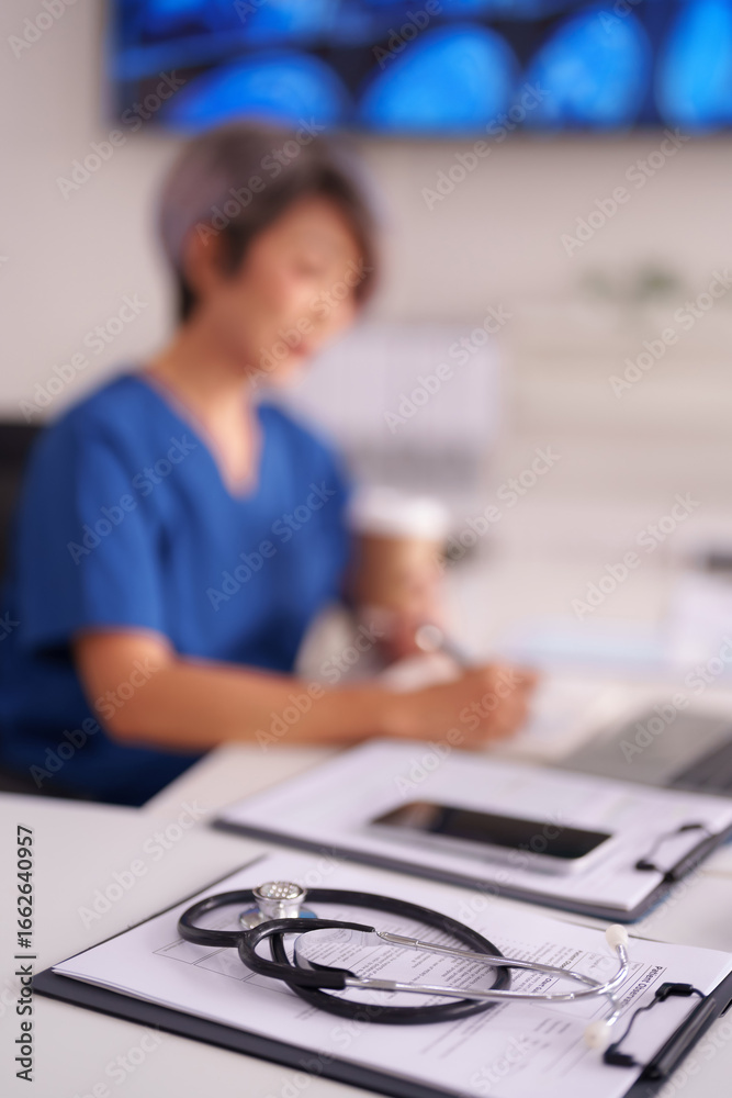 Adult Asian female medical doctor writing patient notes in modern clinic office healthcare setting professional stethoscope foreground