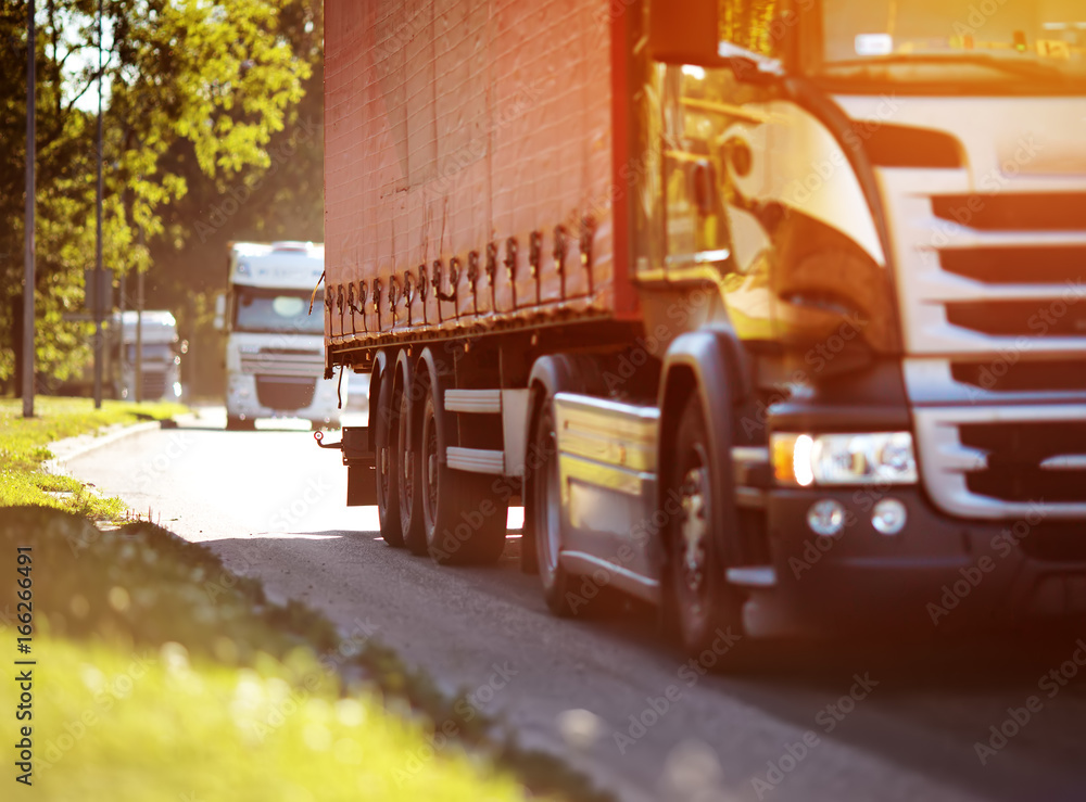 asphalt roadwith a tilt truck. lorry moving on sunny evening