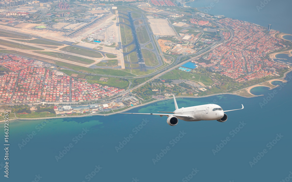 White Passenger plane fly up over take-off runway from airport - istanbul