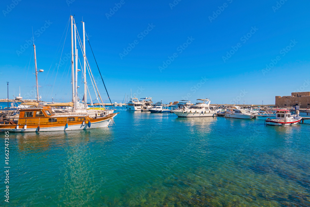 The marina in Paphos, Cyprus, shines under the bright Mediterranean sun — a picturesque spot with docked boats, seaside cafés, and palm-lined promenades, perfect for a relaxing coastal stroll.
