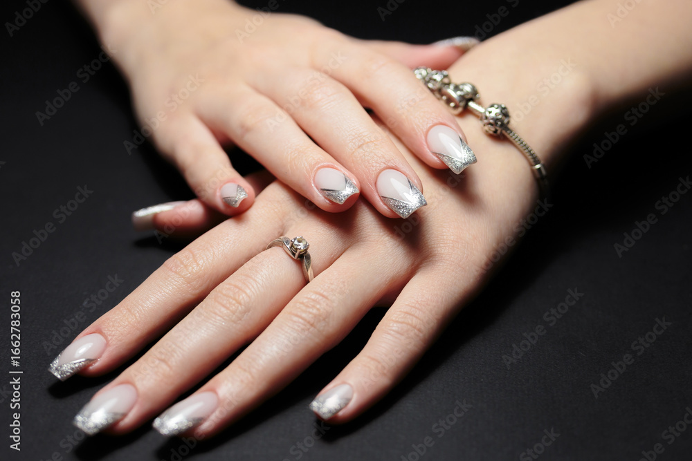 Wedding manicure design. Nails are covered with gel polish and a silver design.