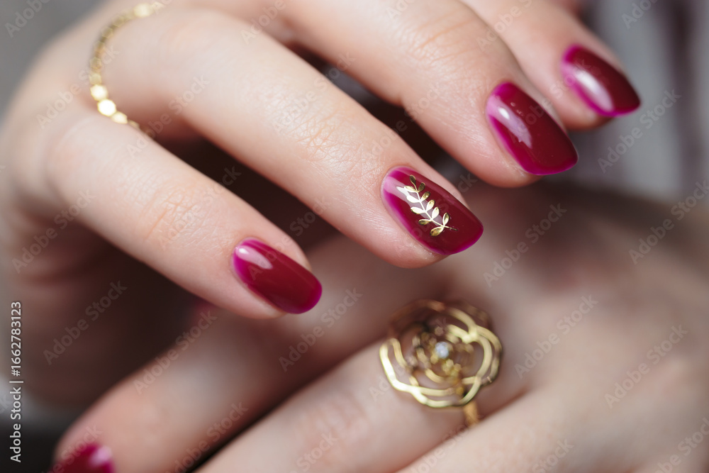 Red manicure with a golden branch design. Women's hands with a beautiful red manicure. Nail design. Manicure with gel polish close-up