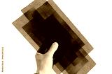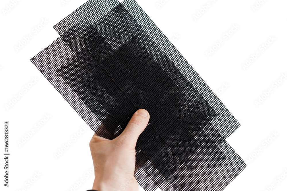 Hand with black sandpaper for polishing a plastering on a white background