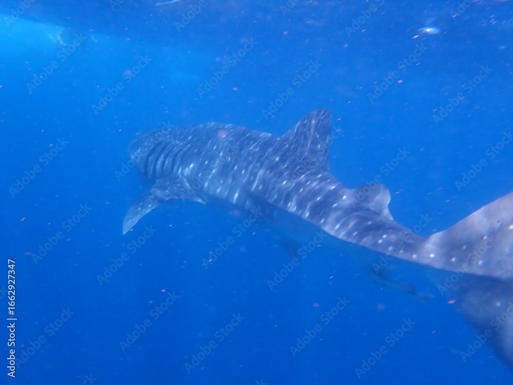 A whale shark (Rhincodon typus) with dark gray skin patterned with white spots, gliding through clear deep blue tropical waters, viewed from the side. Isla Mujeres, Mexico, nature wallpaper background