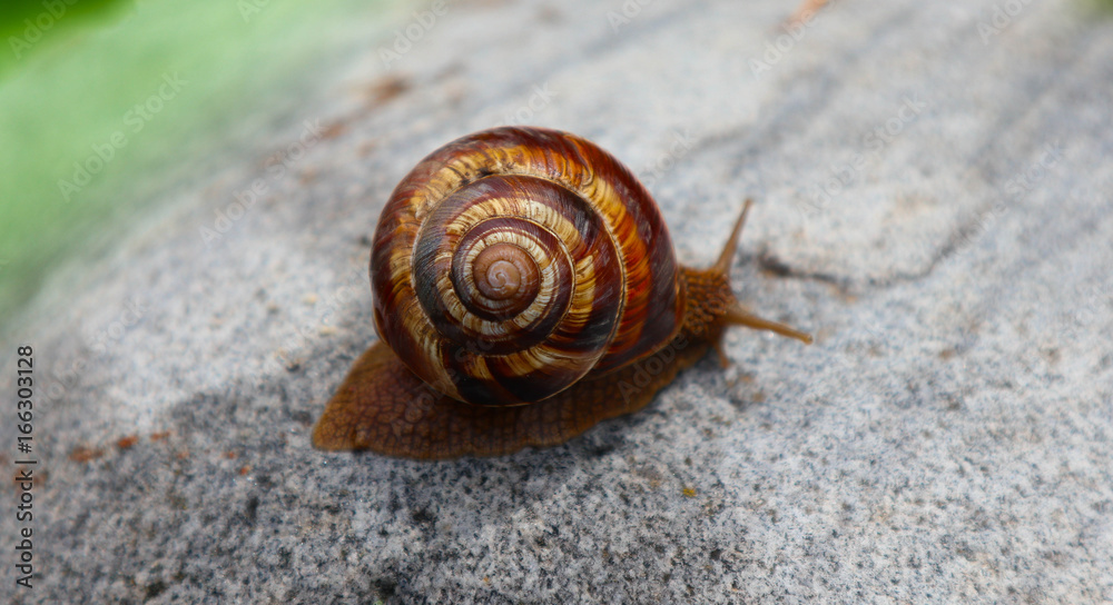 Photo depicts a wild lovely big beautiful snail with spiral shell. Amazing helix in the garden, crawling in a stone. Fresh green grass on the background, good sunny weather. Marco, close up view.