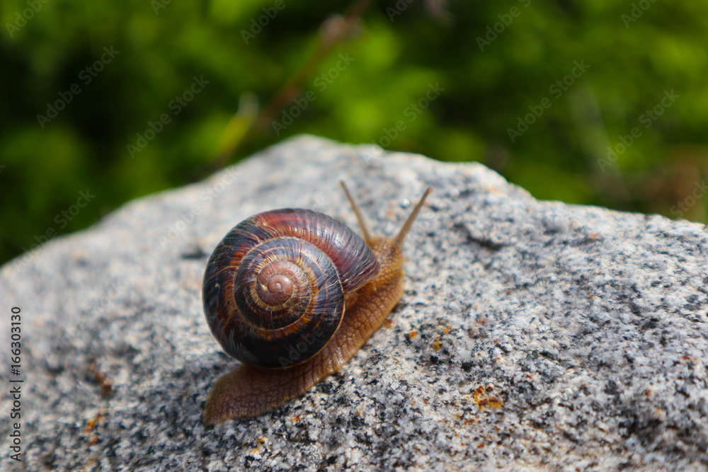 Photo depicts a wild lovely big beautiful snail with spiral shell. Amazing helix in the garden, crawling in a stone. Fresh green grass on the background, good sunny weather. Marco, close up view.